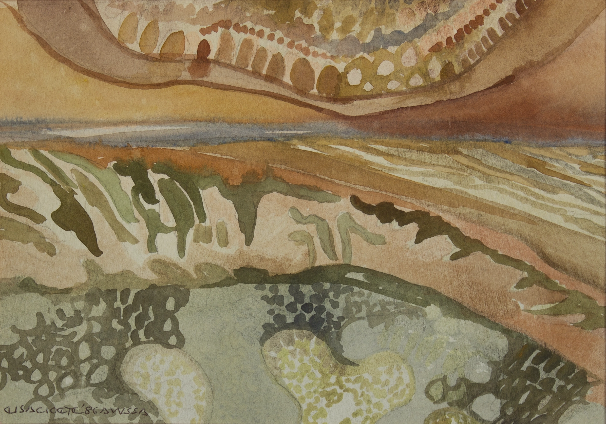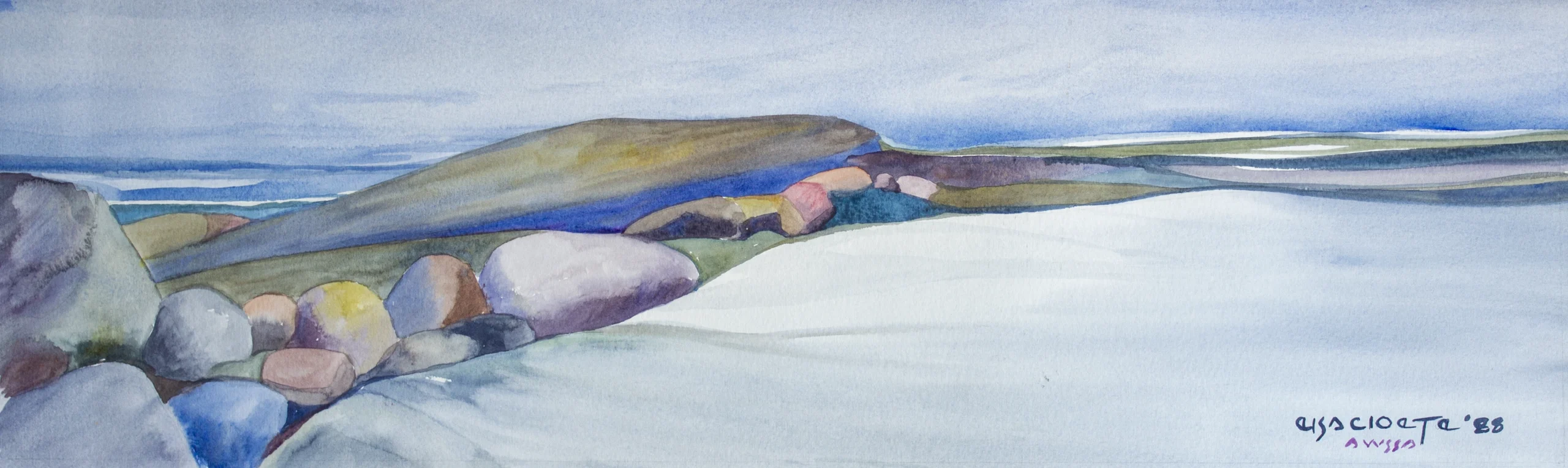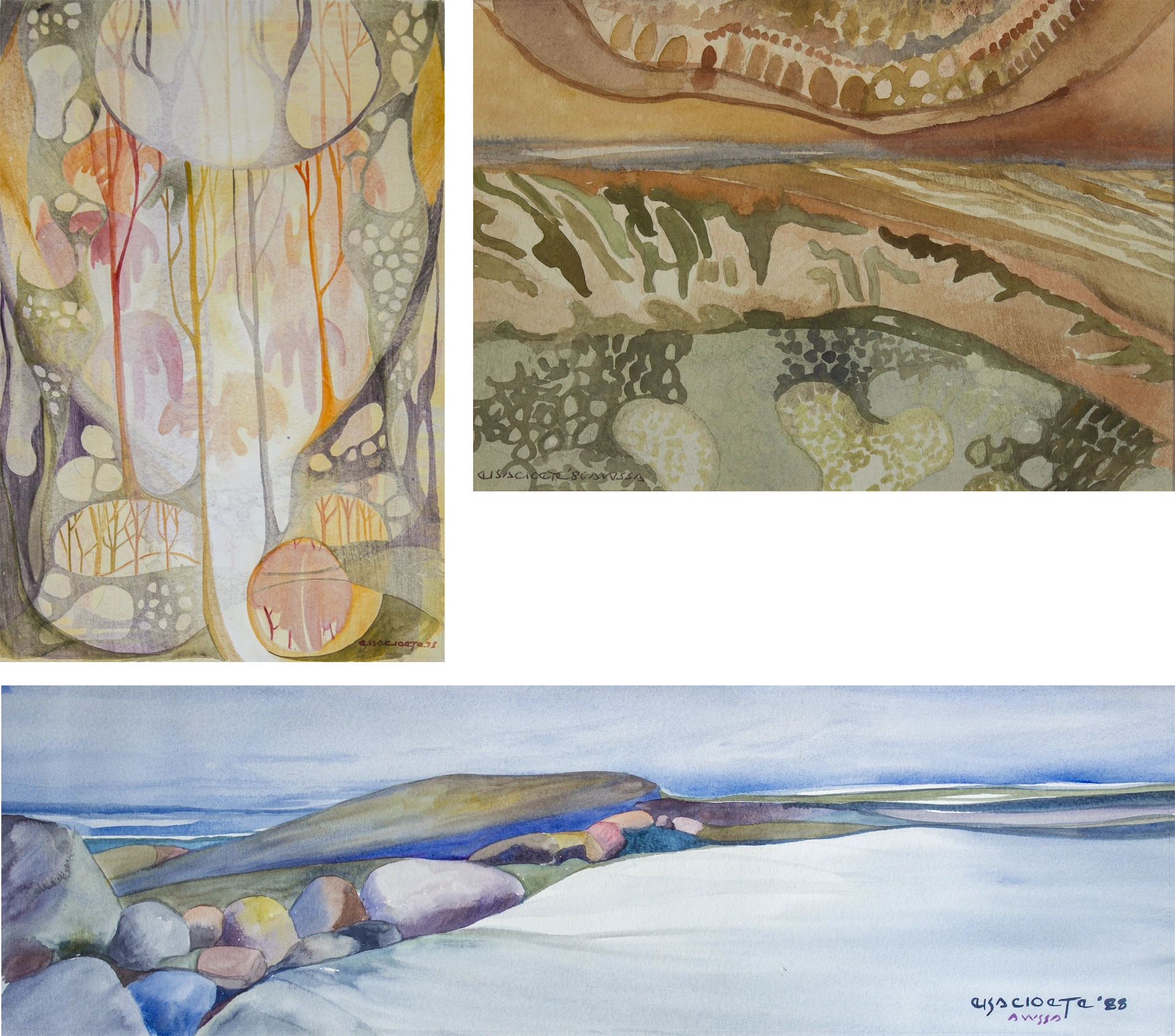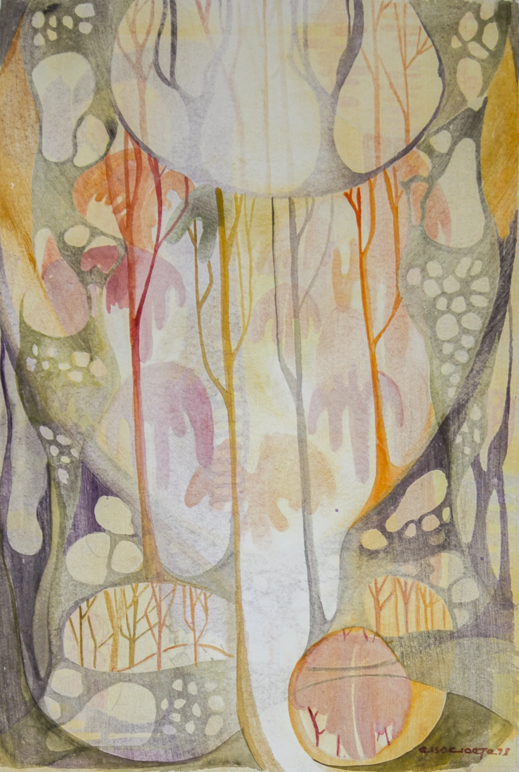 During 1970 I decided to paint full time. The early 1970s was mainly a period of experimental work. It was a search for my own style. During that time, a new medium – polyester resin started to interest me. The resin is mixed with a color pigment applied to glass with clay as outlines. This gives the effect of stained glass. The medium required quick skill because it solidified quickly. This skill later influenced my use of watercolor for the better. Because of the unhealthy influence of the medium on our family, I abandoned it.